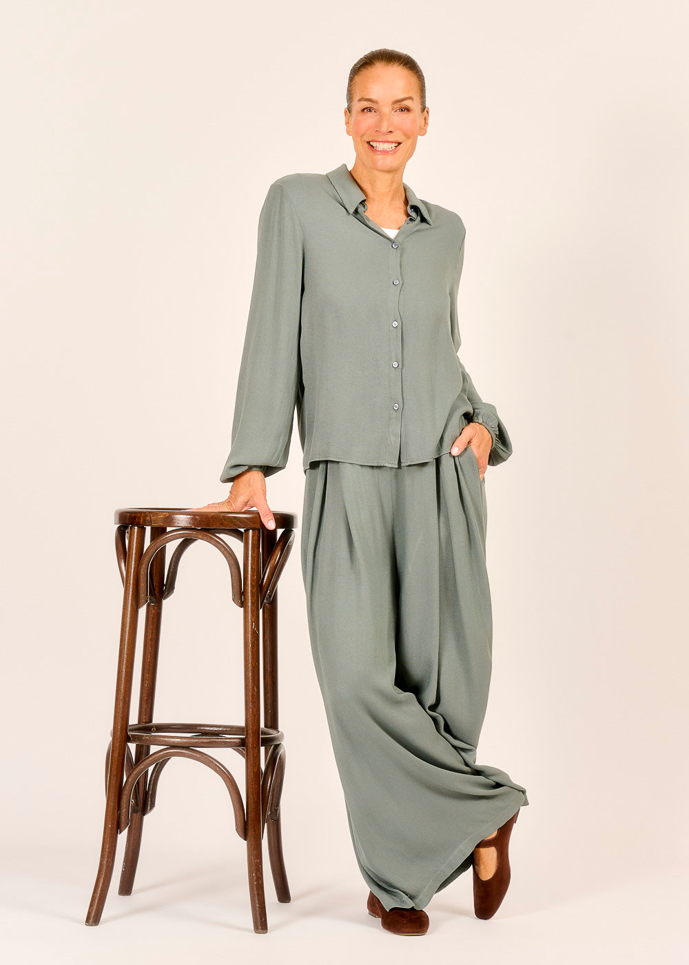 Diese Bluse vereint schlichte Eleganz mit müheloser Leichtigkeit – der fließende Stoff umschmeichelt die Silhouette und sorgt für ein angenehmes Tragegefühl. Mit ihrem zeitlosen Schnitt und den feinen Details wie den dezenten Knöpfen lässt sie sich vielseitig kombinieren – ob lässig zur Jeans oder edel zum Rock. Zusammen mit einer passenden Hose bietet sie eine moderne Alternative zum klassischen Anzug. Ein Must-Have für alle, die Komfort und Stil auf harmonische Weise verbinden möchten.